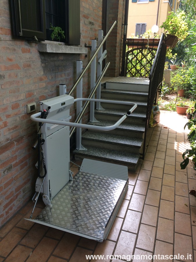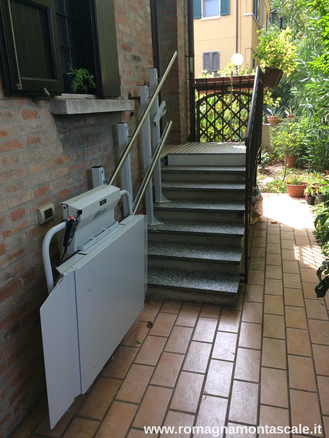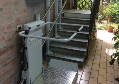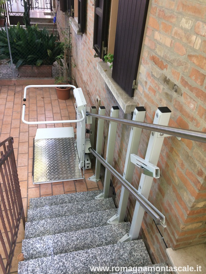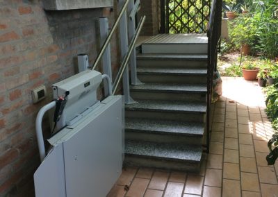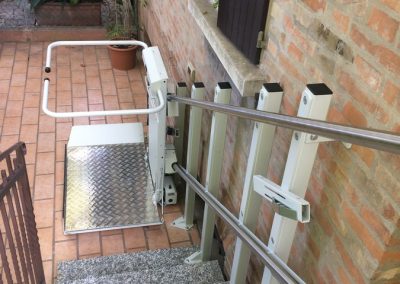 In questo esempio presentiamo appunto un montascale a pedana. Nello specifico, vediamo che si tratta di un montascale rettilineo (su scala dritta). Il modello scelto presenta componenti in acciaio inox, dettaglio di particolare rilievo vista l’installazione in ambiente esterno, e come si può vedere dalle immagini è molto sottile e una volta richiuso ha un ingombro veramente minimo, soprattutto rispetto a molti altri modelli sul mercato.